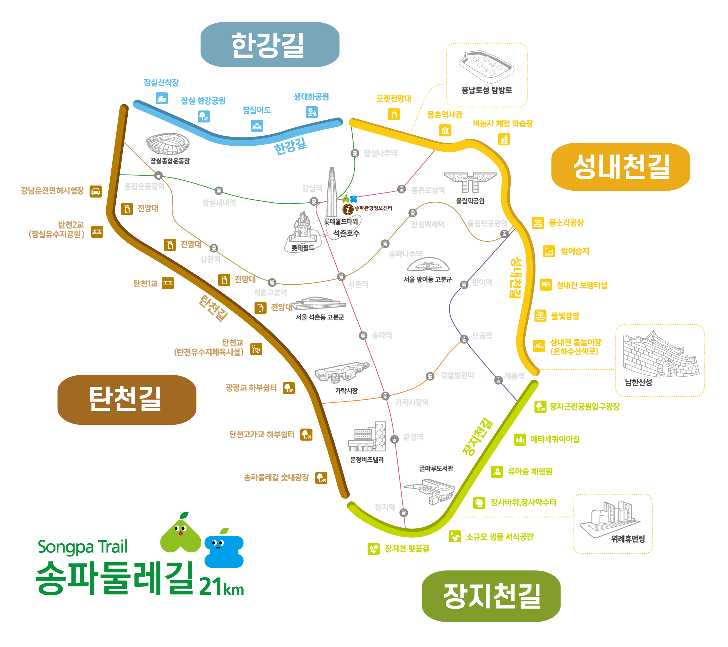 물길과 숲길을 따라 네 구간을 완주하려면 5시간 30분 걸리는데, 올림픽공원·장지근린공원· 방이습지 등 자연 명소와 가든파이브·가락시장 등 송파구의 주요 상권까지 촘촘히 이어져 있어 사통팔달 송파 지역 어디서든 접근 가능하다.